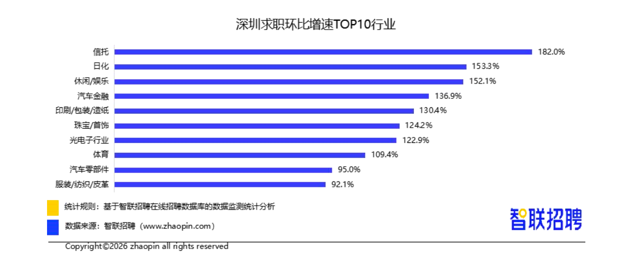 在深圳,节后第二周一些行业的求职人数环比增速惊人。数据显示,深圳“信托”行业求职人数环比增长182.0%,这意味着求职人数在一周内几乎变为原来的三倍。“日化”和“休闲/娱乐”行业增速紧随其后,分别达到153.3%和152.1%。“汽车金融”和“印刷/包装/造纸”行业的求职热度增长也超过130%。