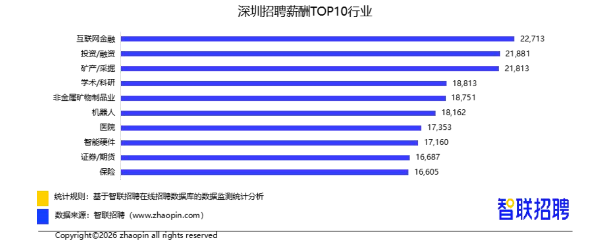 与此同时,深圳的招聘需求也在快速释放。“文化艺术/娱乐”“财务/审计/税务”“汽车后市场”等行业发布的职位数增长显著。在薪资方面,深圳“互联网金融”行业的平均招聘月薪达到22713元,显示出强劲的薪酬竞争力。