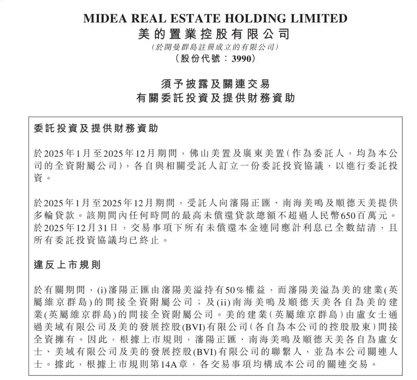 公告披露,在此期间,受托人向沈阳正汇、南海美鸣及顺德天美提供多轮贷款,任何时间的最高未偿还贷款总额不超过人民币6.5亿元。截至2025年12月31日,所有未偿还本金及利息已结清,所有委托投资协议均已终止。